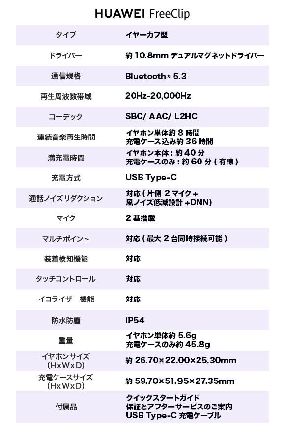 『HUAWEI FreeClip』の主な仕様