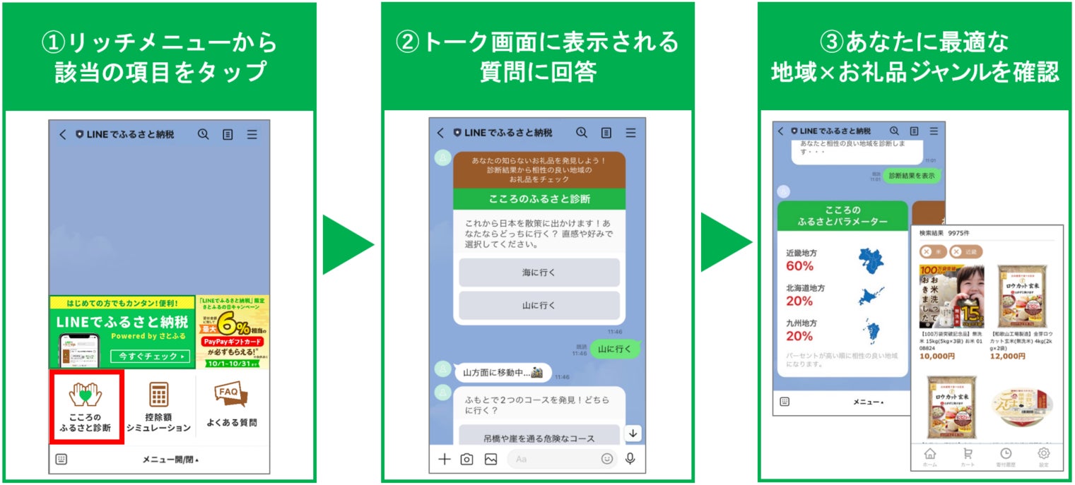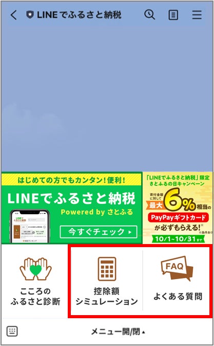 「こころのふるさと診断」に加えて、「控除額シミュレーション」と「よくある質問」がLINE公式アカウント内のリッチメニューに加わりました。ワンタッチで知りたい情報にアクセスでき、それぞれの機能をトーク画面上で利用できます。