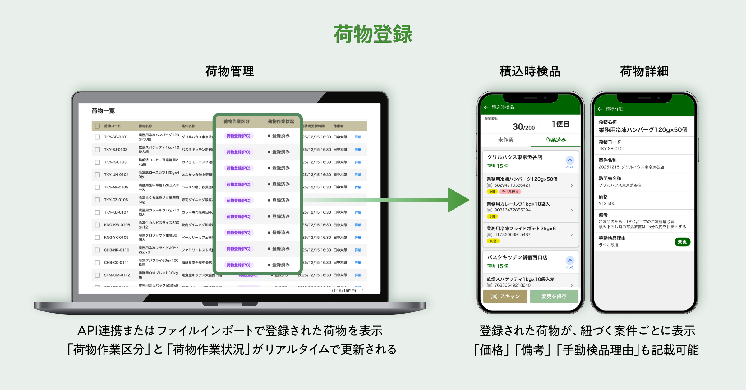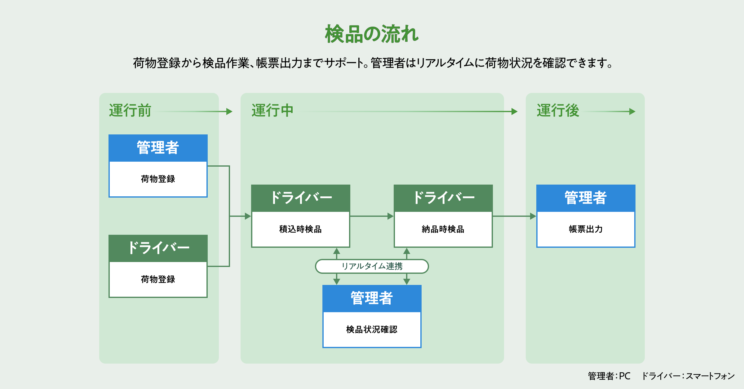 本機能により、積込・納品の工程で、確認作業を効率化し、ドライバーと管理者の情報共有をスムーズにすることで、誤配送防止やドライバーの作業負荷軽減に貢献します。