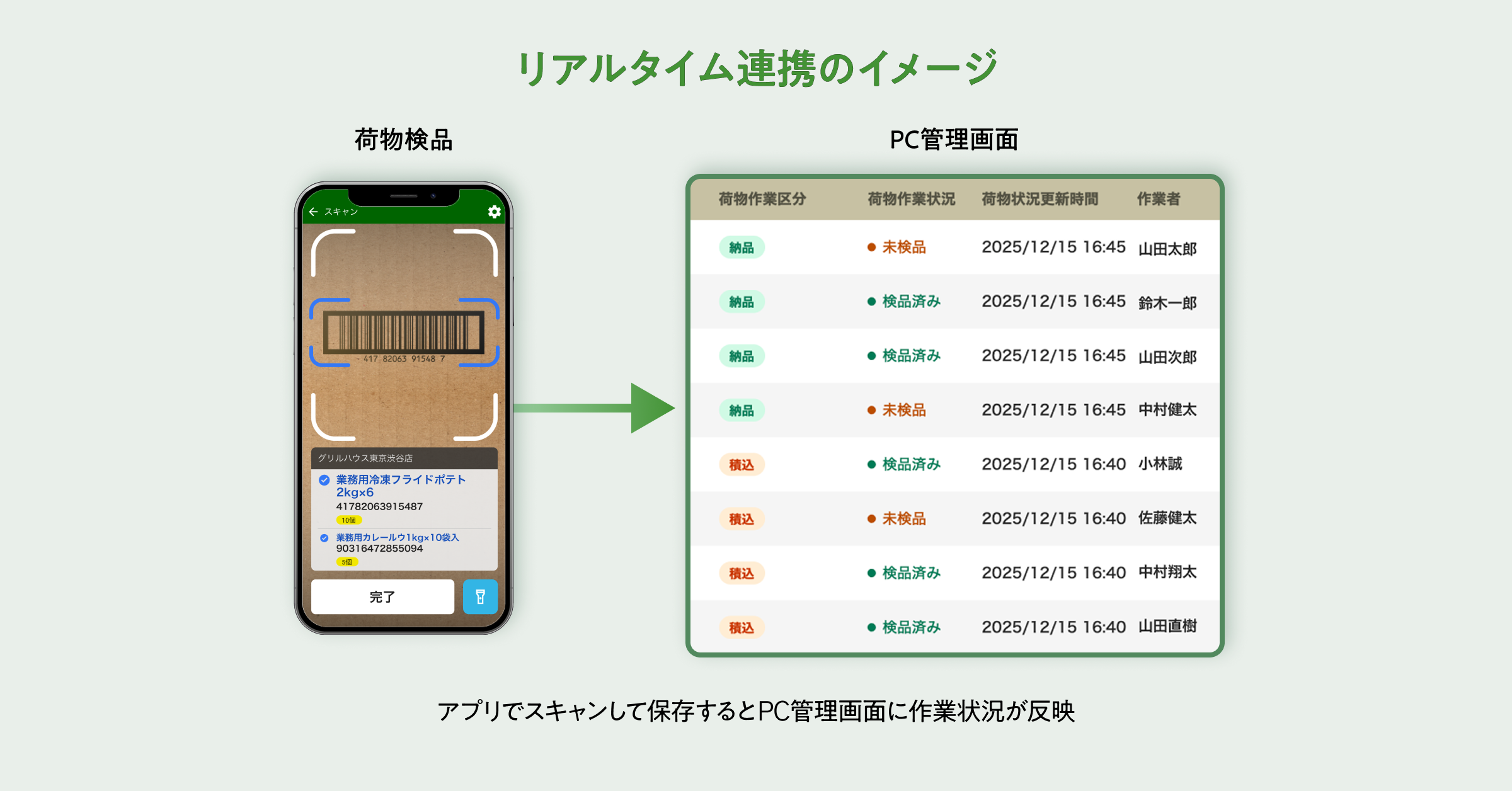 管理者が、PC上の管理画面から、案件ごとに荷物のステータス(未検品/検品済み)をリアルタイムに確認できます。これにより、ドライバーへの電話確認の手間を削減し、万が一トラブルが発生した際も迅速な原因特定と対応を行う一助となります。