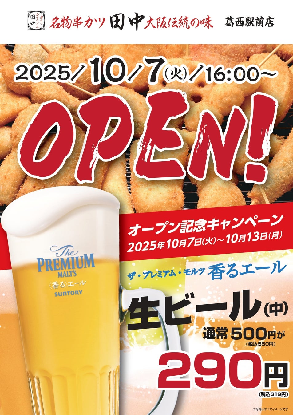 株式会社串カツ田中ホールディングス(本社:東京都品川区東五反田、代表取締役社長:坂本 壽男)の子会社である株式会社串カツ田中は、2025年10月7日(火)に「串カツ田中 葛西駅前店」をオープンいたします。