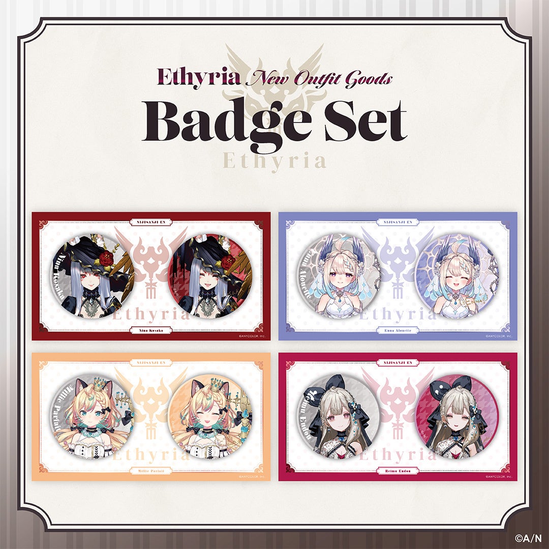 Nina Kosaka(狐坂 ニナ)、Enna Alouette(エナー・アールウェット)、Millie Parfait(ミリー・パフェ)、Reimu Endou(遠藤霊夢)の新衣装ビジュアルを使用した「アクリルスタンド」と「缶バッジセット」の「Ethyria New Outfit Goods」は、にじさんじオフィシャルストアとNIJISANJI EN Official Storeにて、2022年11月28日(月)9時半から2022年12月18日(日)23時59分まで受注販売を行います。