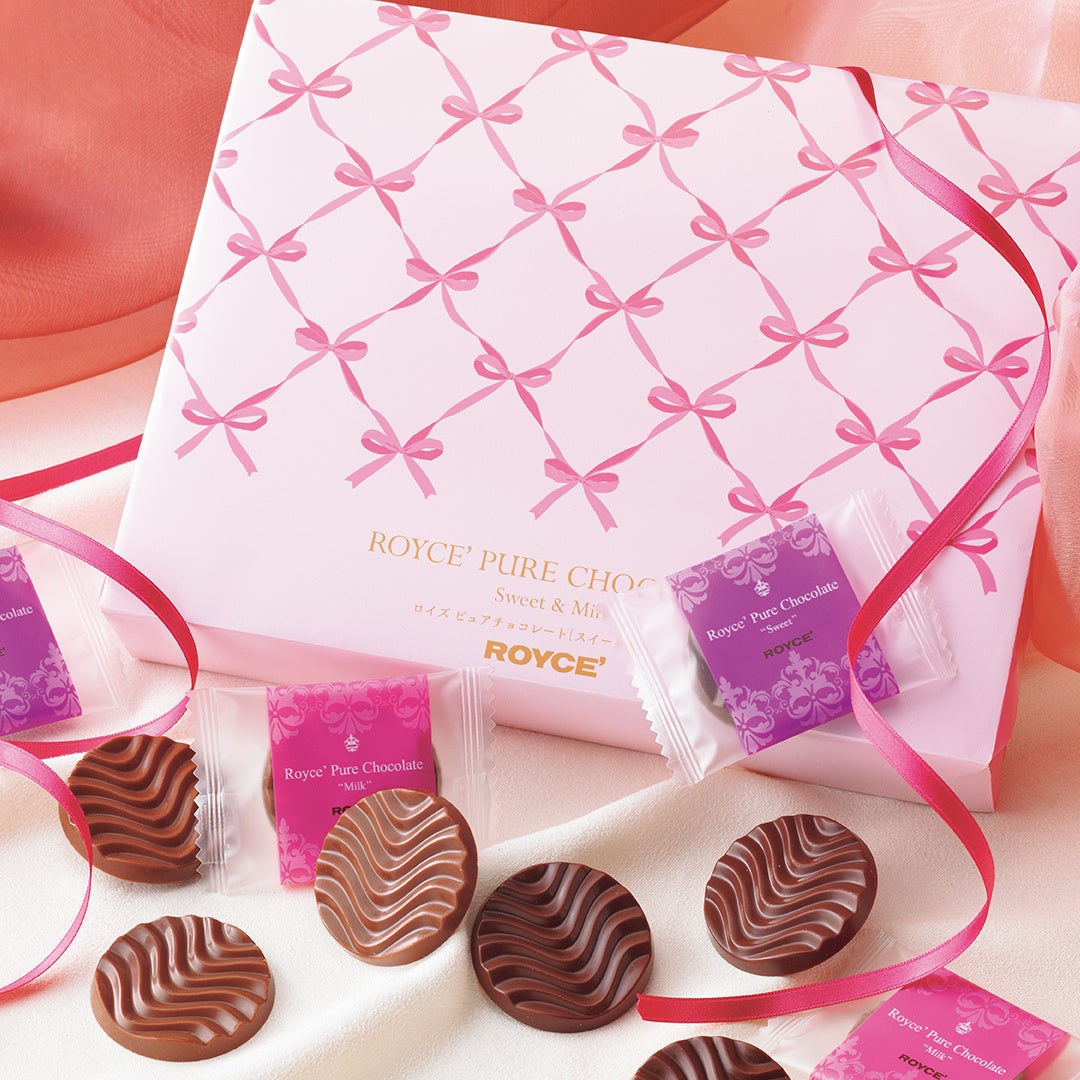 酸味と苦みが調和したすっきりとした味わいの[スイート]と、カカオとミルクの味わいを生かしバランスよくまろやかに仕上げた[ミルク]の詰め合わせ。ピュアチョコレートの人気の味をピンクのリボンのデザインをあしらったエレガントな包装紙で包みました。