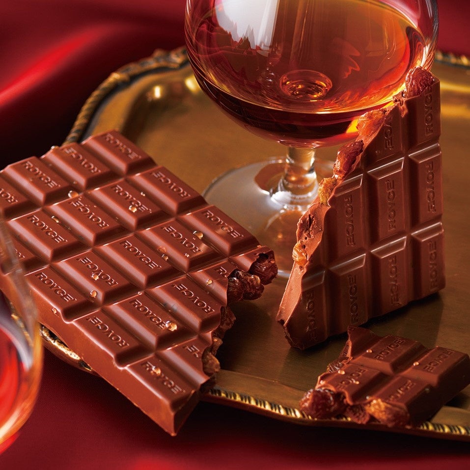 コニャックにじっくり漬け込んだレーズンを、まるごとミルクチョコレートに散りばめました。コニャックの甘い香り、円熟味のある風味とレーズン、チョコレートがひとつにとけ合い、奥深い味わいが広がります。