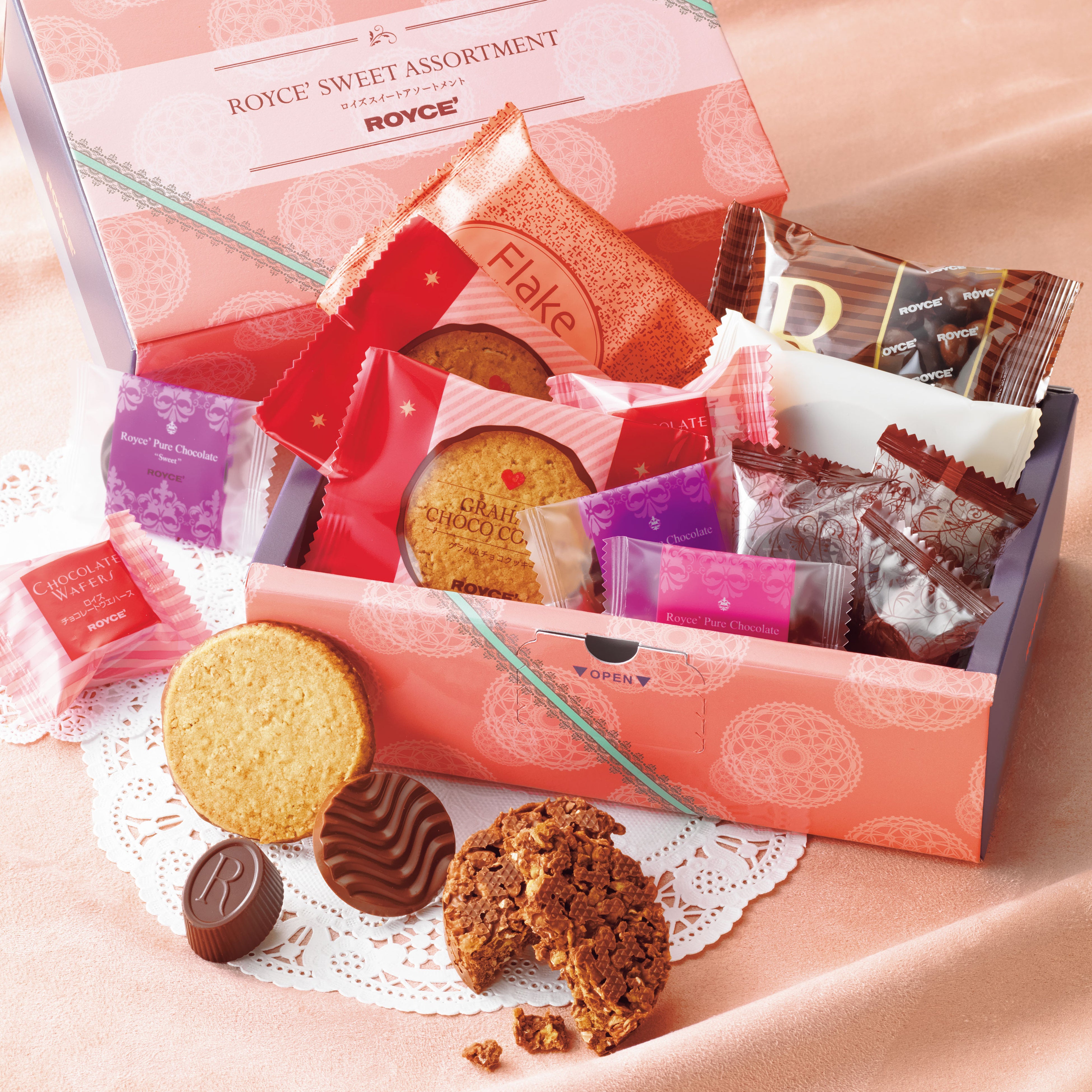 ロイズアールショコラ[カフェモカ]やグラハムチョコクッキーなど、バレンタイン限定の味わいを中心に、多彩なおいしさを詰め合わせました。繊細なレースとリボンのデザインをあしらったパッケージは、贈り物にもぴったりです。