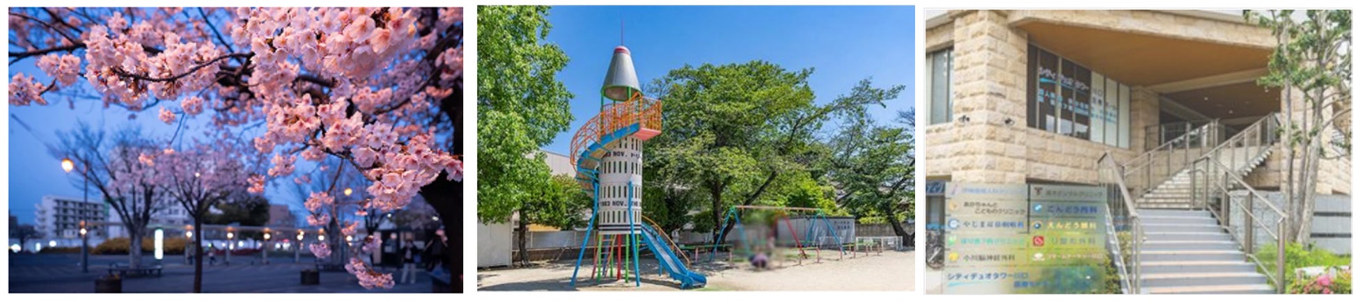 ※左から芝川公園(徒歩2分)、元郷第5公園(ロケット公園)(徒歩6分)、シティデュオタワー川口医療モール(徒歩4分)