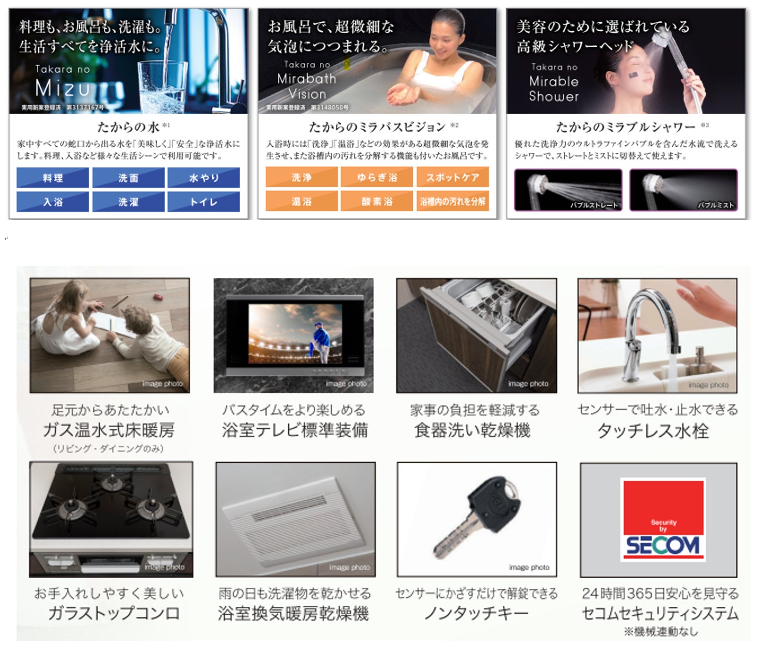 グッドデザイン賞受賞のウォーターシステム「ルイックプロジェクト」をはじめ「浴室TV」や「ガス温水式床暖房」など当たり前に便利で、当たり前に美しく。そんな想いを込めて、毎日の暮らしをスマートに演出し、ひとつ上のライフスタイルを叶える機能とデザインを兼ね備えた洗練の設備・仕様を随所に取り揃えました。