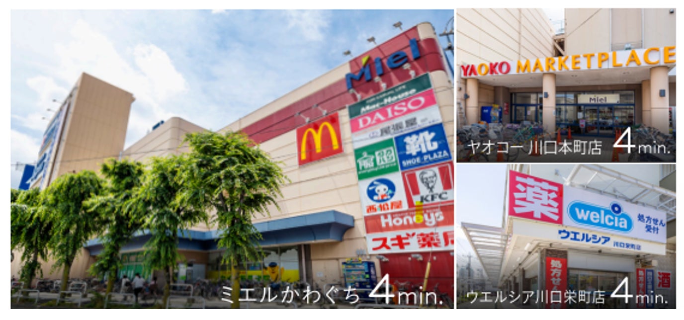 川口元郷エリアは商業、医療、公園をはじめ、様々な都市機能が駅前を中心に揃うコンパクトシティ。スーパーやコンビニ、ドラッグストアをはじめ、様々な商業施設が身近に揃い、39の専門店で構成された「ミエルかわぐち」までは徒歩4分。ヤオコー、100円ショップ、飲食店、家電量販店など、バラエティ豊富な店舗が集約されています。