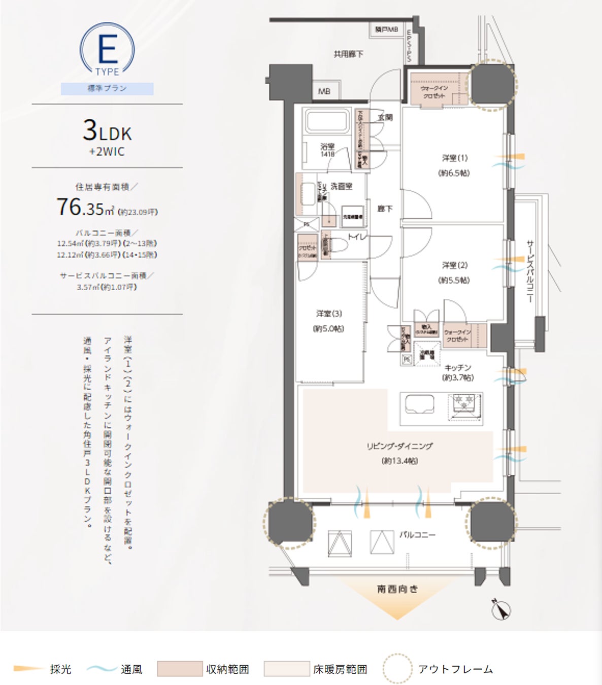 子育て世帯も伸びやかにお住まいいただける3LDKを中心とした、居住性の高い専有空間をプランニング。さらに全邸南西・南東向きとすることで通風・採光にも配慮。