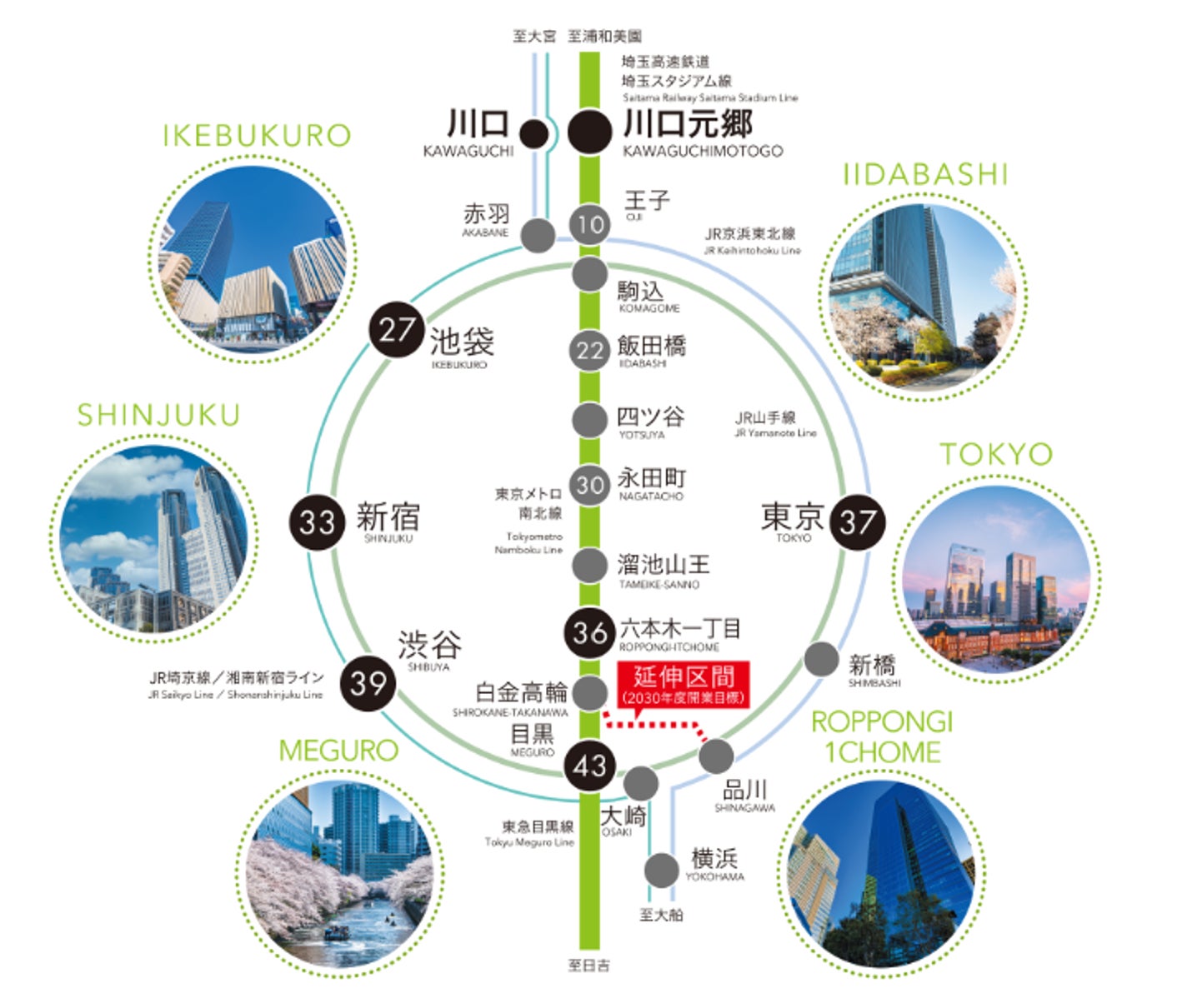 東京メトロ南北線乗り入れで「飯田橋」駅や「四ツ谷」駅、「六本木一丁目」駅、「目黒」駅など、都心の魅力あふれるエリアへと直通アクセスが可能です。徒歩16分のJR京浜東北線「川口」駅を利用すれば、新宿方面や東京方面への移動も便利です。また、東京メトロ南北線は、2030年度を開業目標として「品川」駅へ延伸予定※1となりますのでさらなる利便に期待が出来ます。