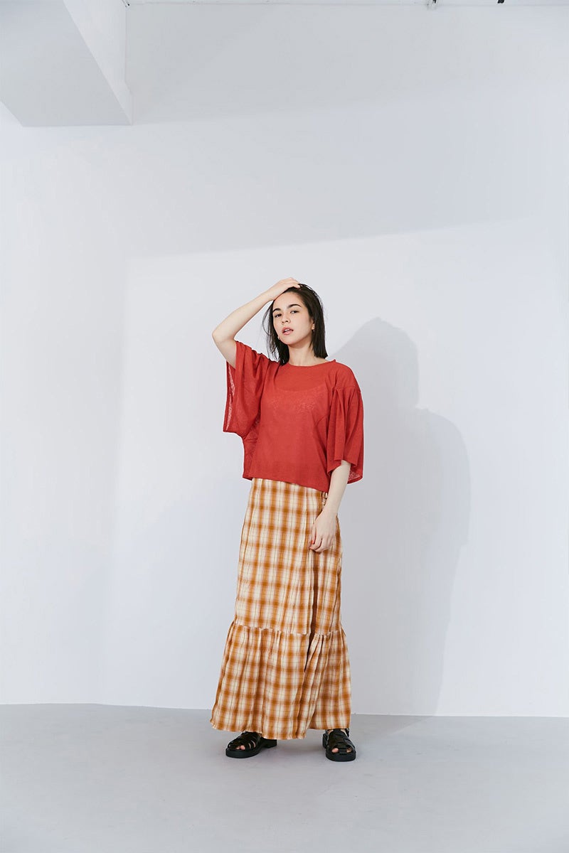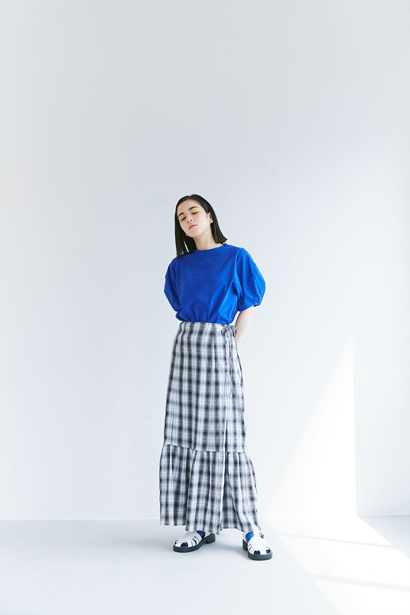 チェック柄と凹凸感が目を惹くマーメイドラインのスカート。少しゆったり目に加え、後ウエストはゴム仕様なのでストレスフリーに着用できます。