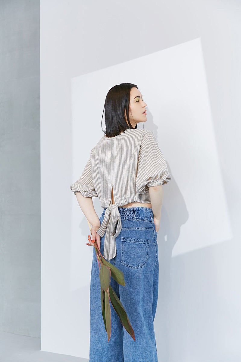 爽やかなストライプ柄がと凹凸感が印象的なデザイン。たっぷりギャザーの袖もポイント。前開き仕様になっているので、羽織としても着用できます。