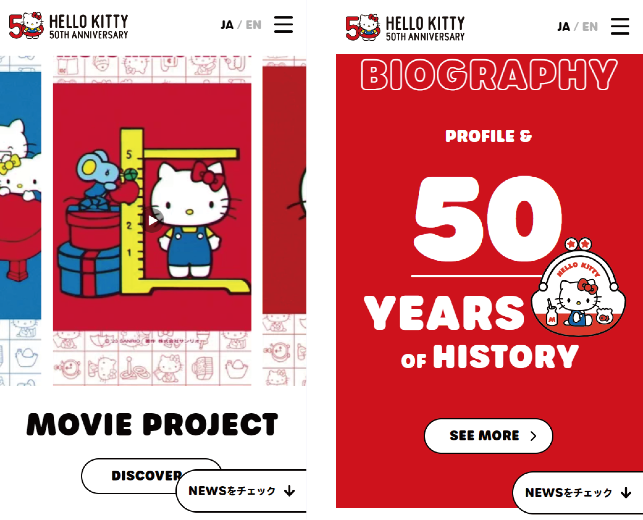ハローキティ50周年の新商品とイベント情報がまとまった「ニュースページ」や、キティの想いのつまった「ムービーページ」、キティのこれまでのあゆみが見られる「バイオグラフィページ」など盛りだくさん。ぜひチェックしてみてくださいね。