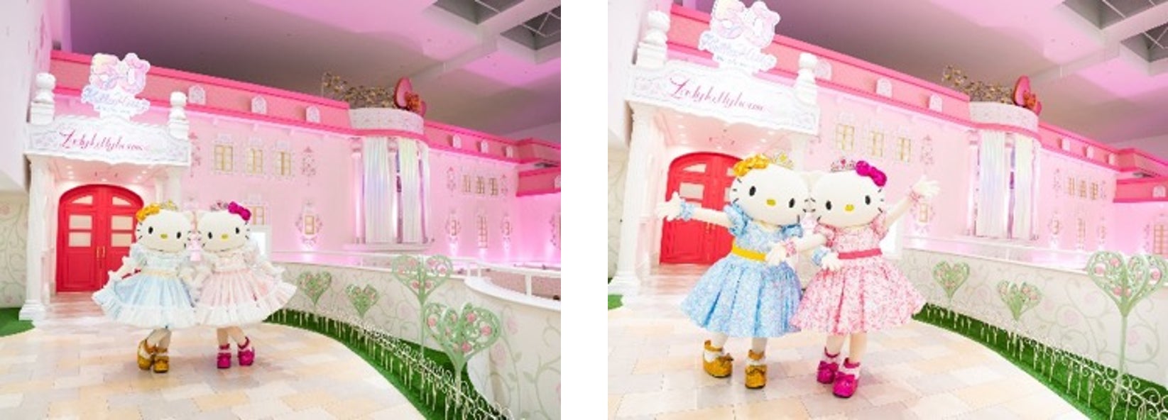 アニバーサリーを記念した新コスチュームを本日初お披露目。ハローキティが大好きなローズをモチーフにしたワンピースで、オーロラ色のオーガンジーワンピースドレスの有無で違った雰囲気を楽しむことができます。双子の妹・ハローミミィが着る色違いのドレスや頭にのせたティアラにも注目です。