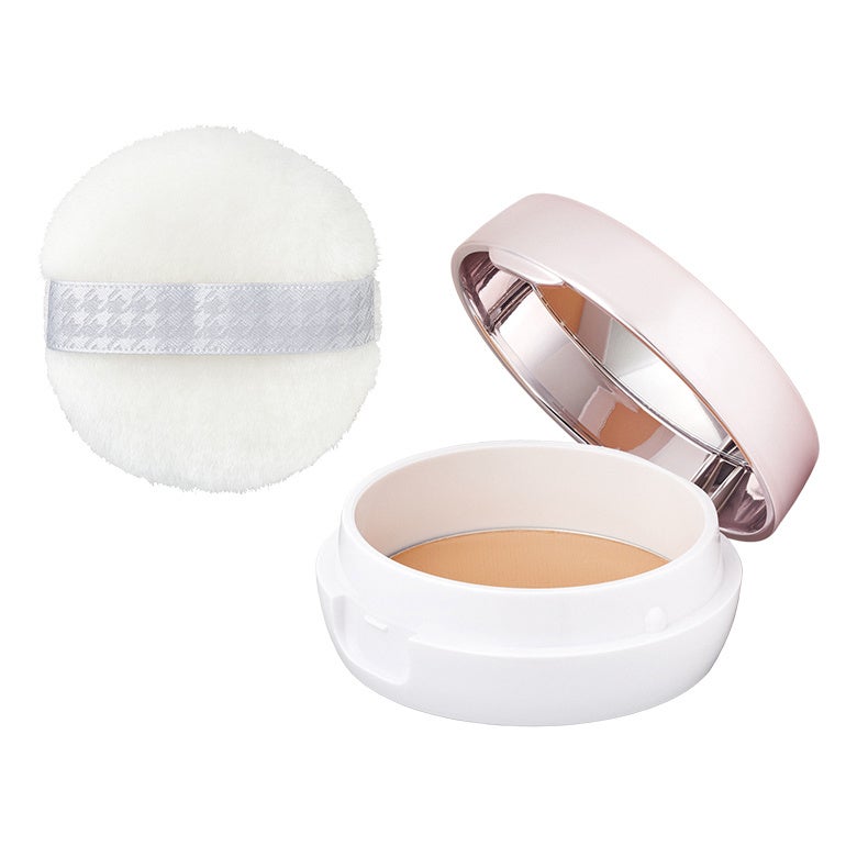 化粧下地のあと、パフに適量をとり、肌を軽くおさえるようにつけます。