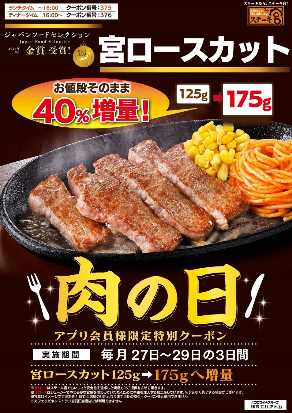 今月は、年に1度のいい肉の日!宮ロースカットをお値段そのままで40%増量(125g→175g)できるクーポンを、公式アプリ「アトムアプリ」で配信いたします。