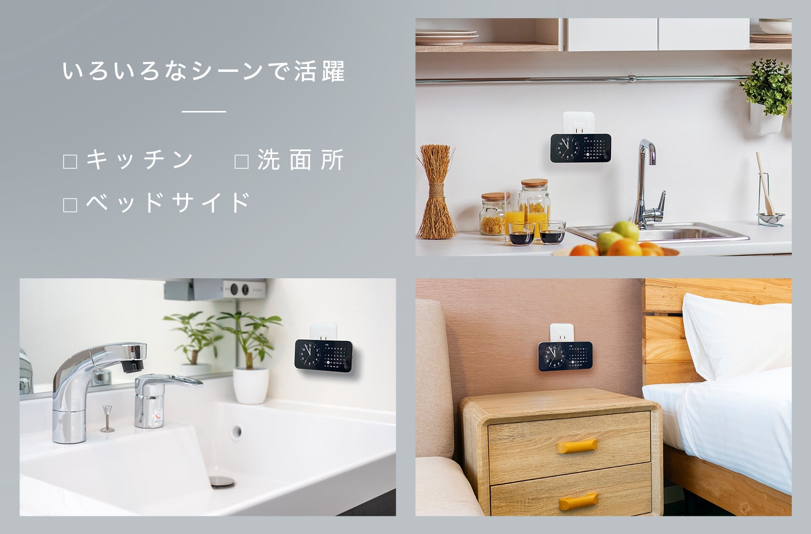 Qi2を採用した本機はスマートフォンをマグネットで吸着できるため、垂直面でも充電が可能です。これにより、壁コンセントや電源タップ直上といった、今まで考えられなかった場所を充電スポットにできます。洗面台やキッチンでは、邪魔なケーブルを気にせず充電しながら音楽や動画をお楽しみいただけます。またベッドサイドでは就寝時にアラームをセットし、スマートフォンを吸着充電といった使い方が可能です。