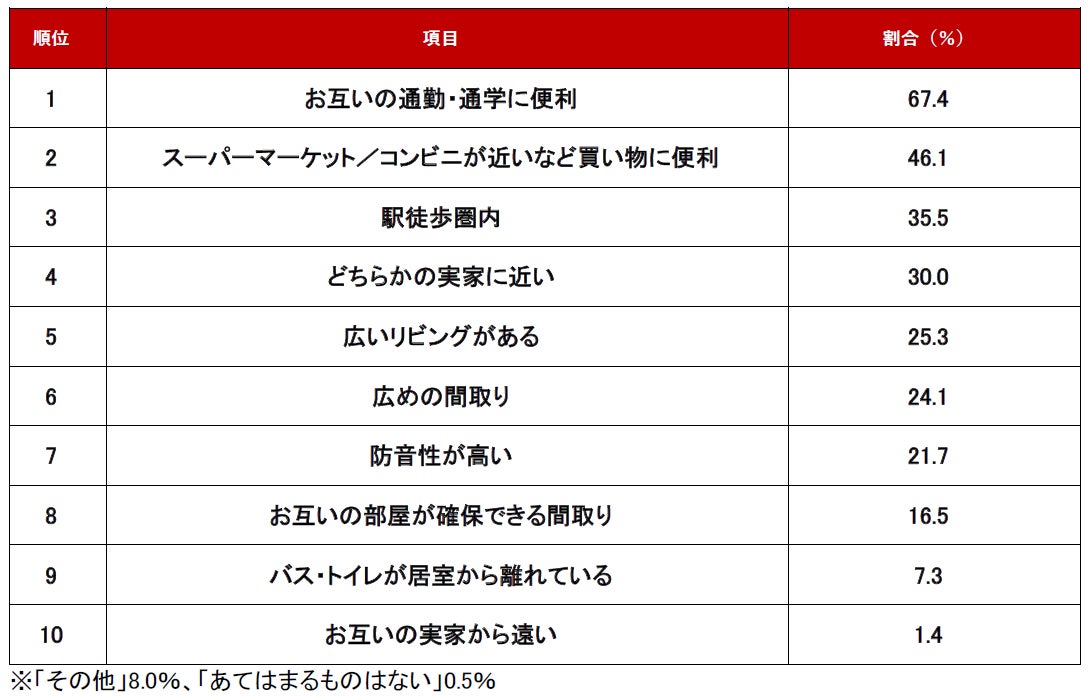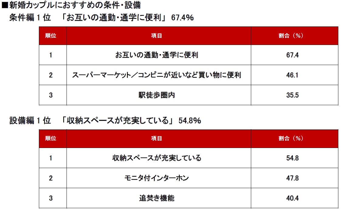 ~条件編1位「お互いの通勤・通学に便利」、設備編1位「収納スペースが充実している」~