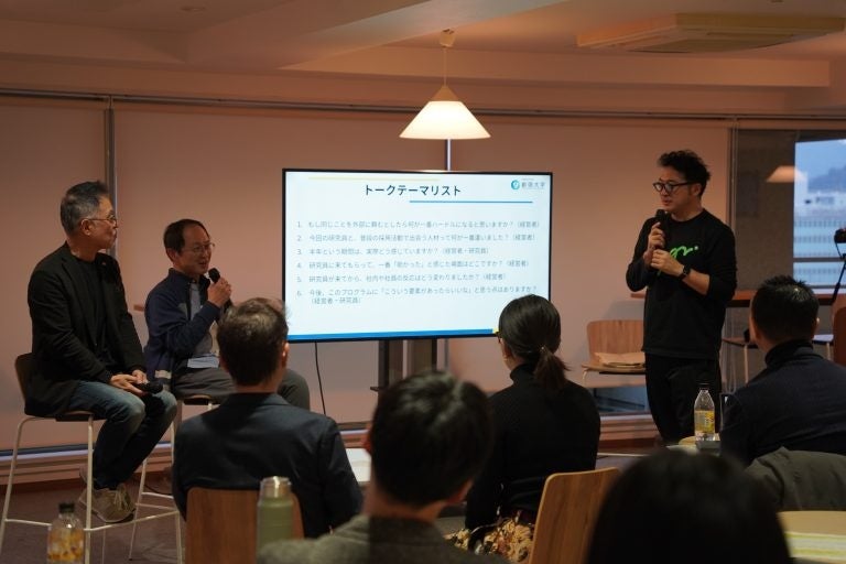 本報告会は、都市圏から参画した客員研究員が県内企業の現場に入り、約4か月間取り組んできた内容や、企業内で生まれ始めている変化を共有することを目的に実施しました。当日は、地域企業の経営者、行政関係者、メディア関係者などにご参加をいただきました。