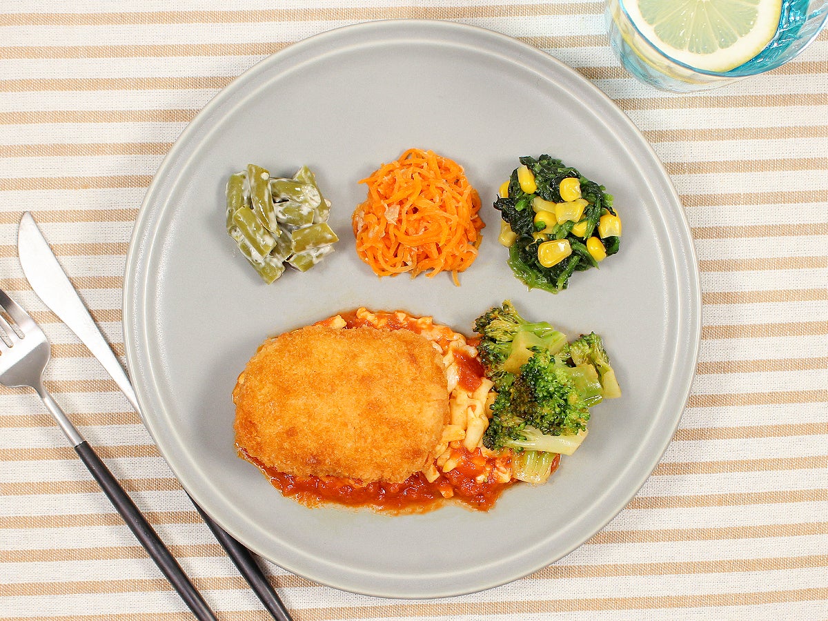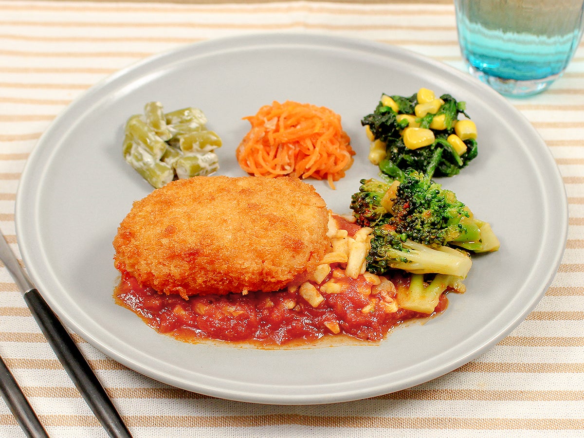 人気メニューがリニューアル!クリームコロッケのおいしさはそのままに、濃厚なチーズと爽やかな酸味のトマトソースが、より絡むように見直しました!クリームコロッケと一緒にすくって食べていただくのがおすすめです。副菜は、インゲンタルタル、ツナが入ったキャロットラペ、ほうれん草とコーンのソテーです。