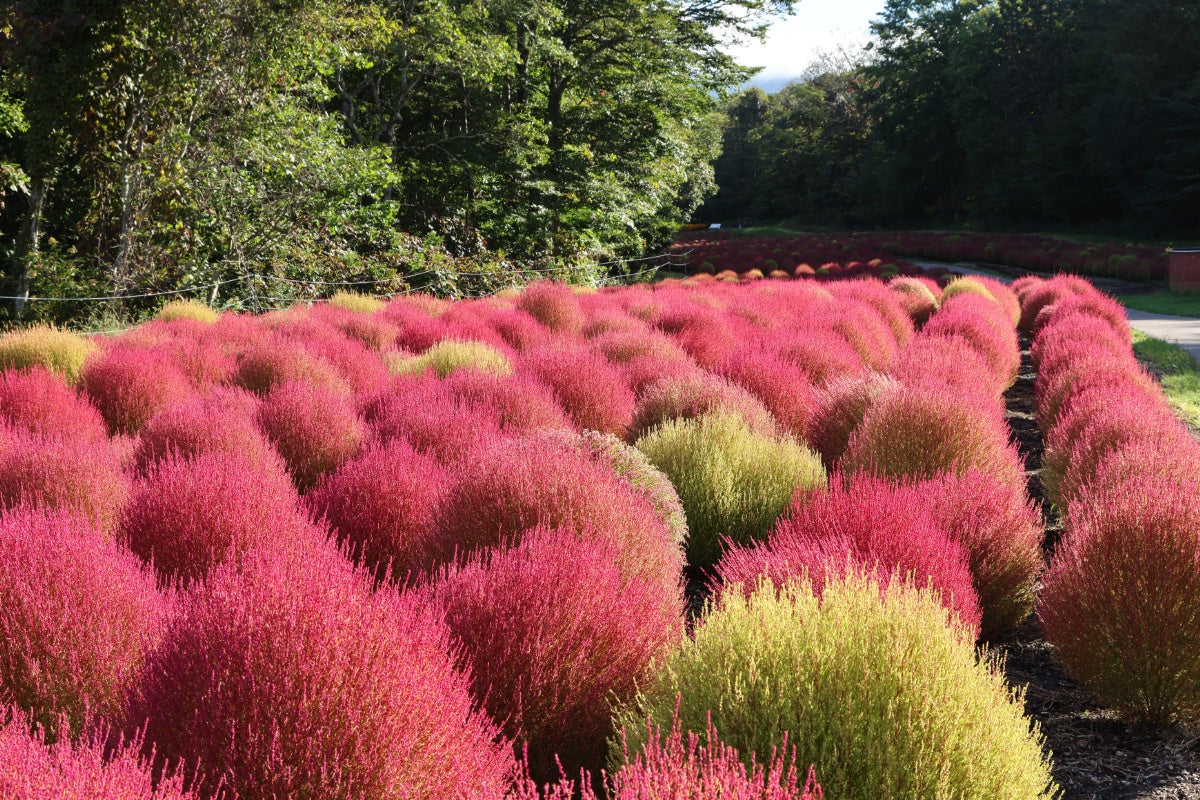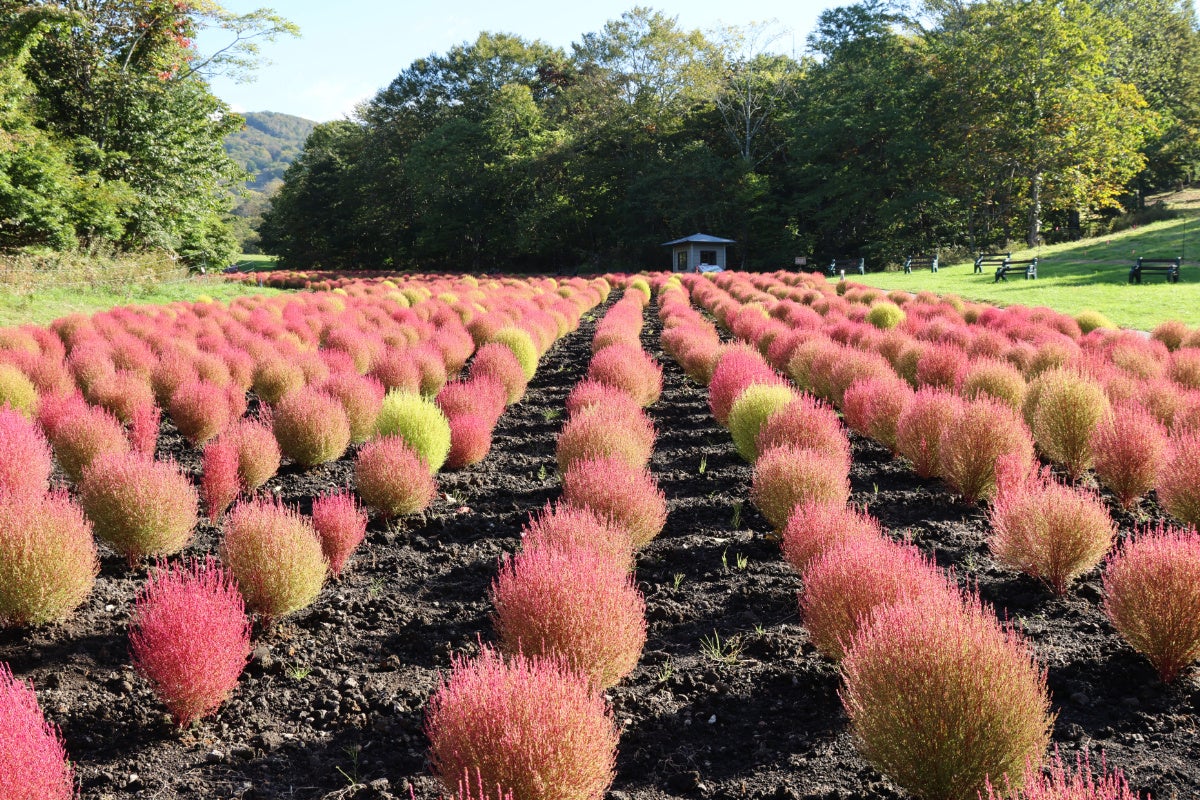 園内では約 1 万株のコキアが赤く色づき、今週末にかけて最盛期を迎える予定です。コキア(別名:ホウキグ サ)は、ふわふわモコモコとした可愛らしい見た目の植物で、鑑賞用としても非常に人気があります。たんばらコキアガーデンでは、エリア一面真っ赤に染まったコキアの紅葉を 10 月 15 日(日)まで鑑賞することができます。