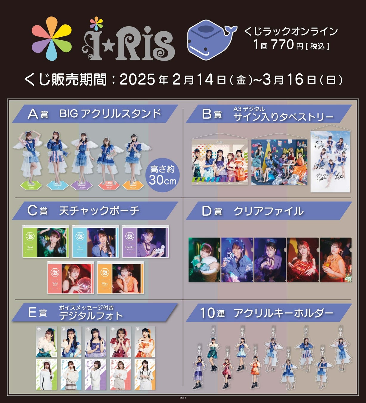カルチュア・エンタテインメント株式会社は、『i☆Ris』とコラボレーションした、ハズレ無しでオリジナルグッズがゲットできるオンラインくじ「くじラックオンライン」を2025年2月14日(金)より発売いたします。賞品はA賞~E賞まで、さらに、くじ1枚ご購入ごとにWチャンス賞の抽選が行われ、当選した方は特別な賞品が獲得できます。