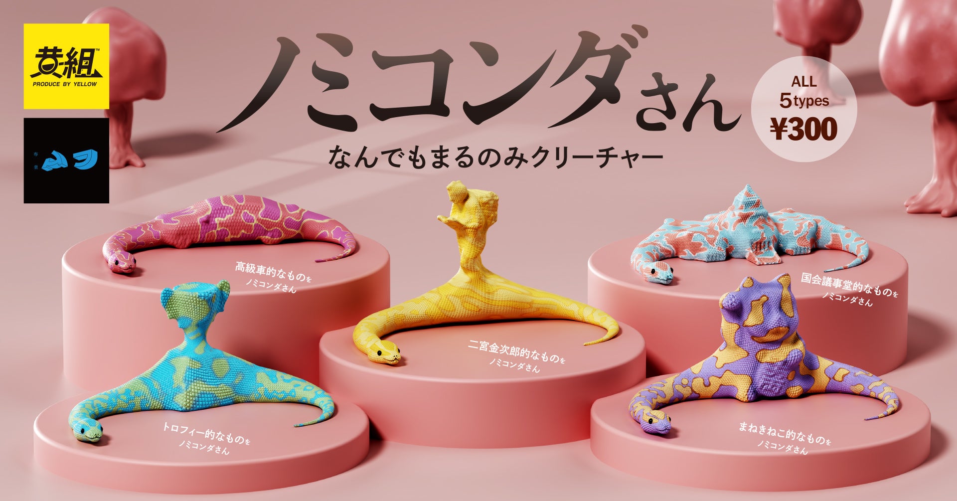 思わずムフッと笑っちゃうモノづくりを行うプロダクト開発チーム「専業ムフ」から、なんでもまるのみクリーチャー「ノミコンダさん」のマスコットフィギュアが登場!