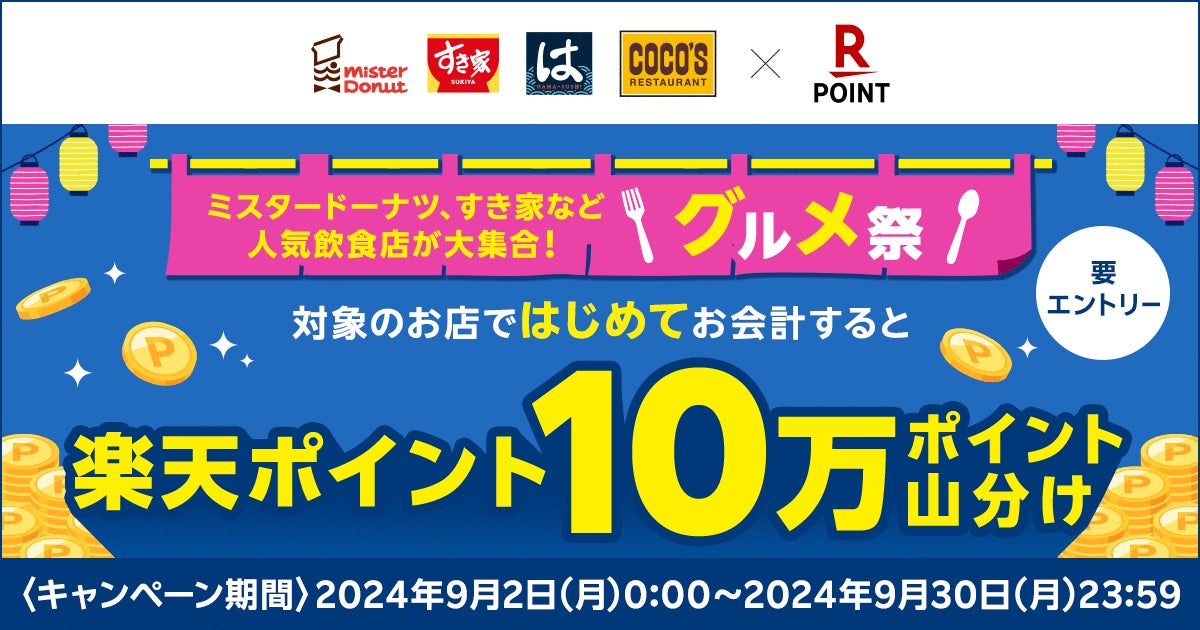 楽天ペイメント株式会社(以下「楽天ペイメント」)は、共通ポイントサービス「楽天ポイントカード」において、飲食に関連する加盟店が参画する「人気飲食チェーン大集合!対象店舗の初めての利用でもれなく10万ポイント山分けグルメキャンペーン!」を2024年9月2日(月)から9月30日(月)まで実施します。