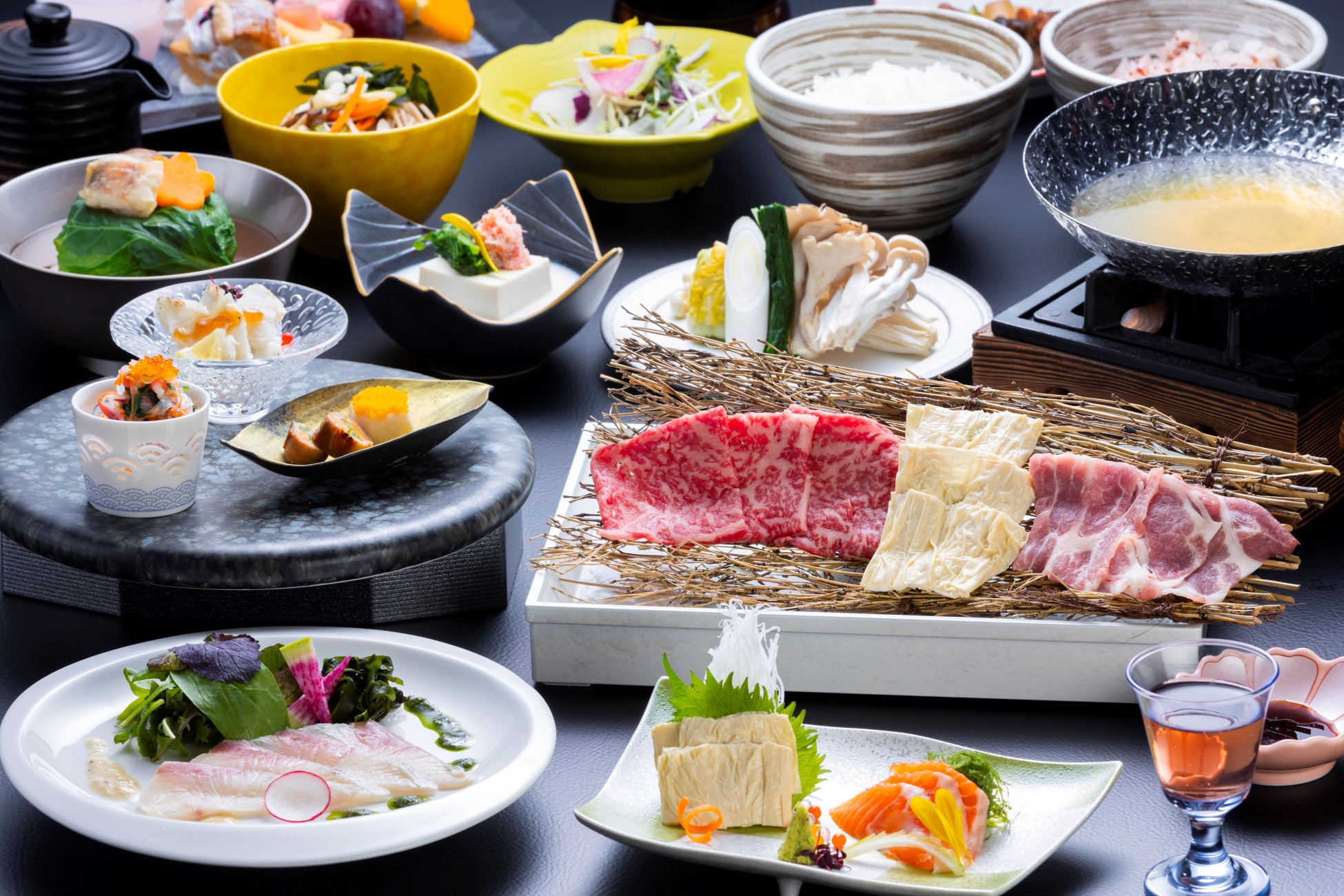 12月からのメインは「休暇村オリジナル柚子胡椒ドレッシング」をベースに、香り高い九州産の柚子果汁をたっぷりと使用した柚子胡椒の風味引き立つ特製柚子胡椒仕立ての鍋。栃木の豊かな自然の中で育まれた特産ブランド牛「とちぎ霧降高原牛」と「日光HIMITSU豚」、日光特産「生湯波」とともにご堪能ください。