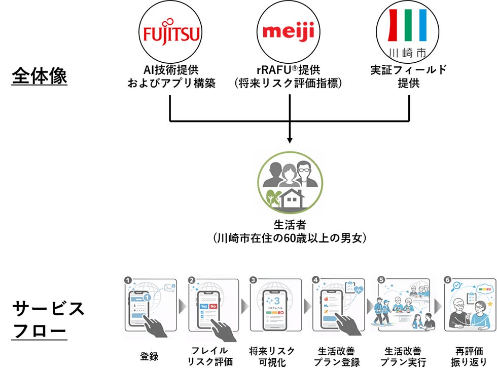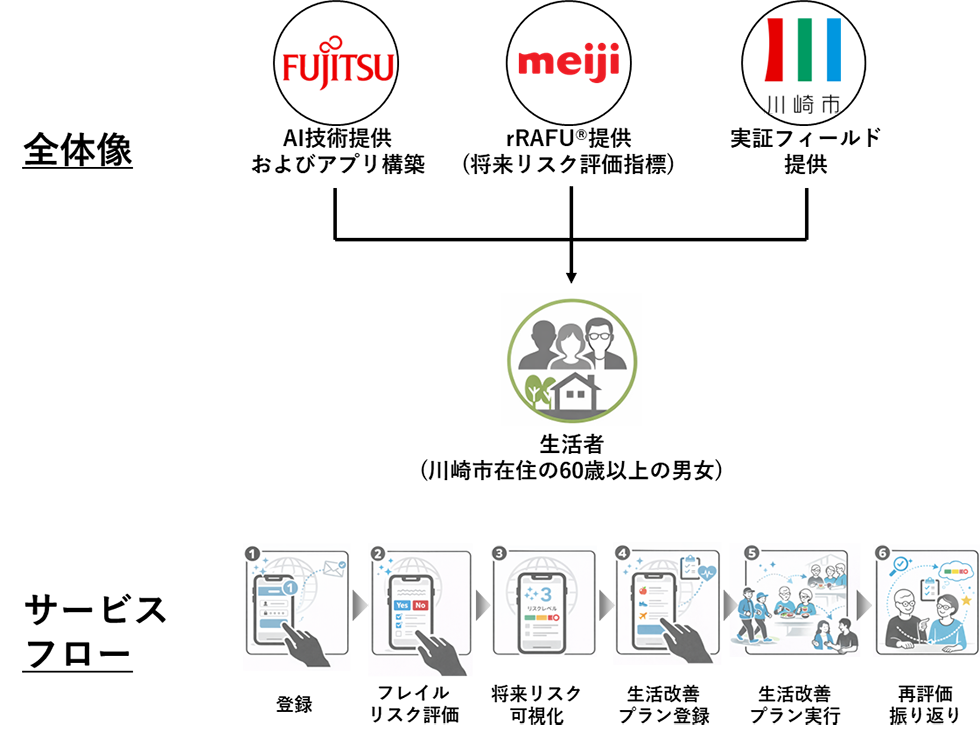 明治は、将来の低栄養・フレイルリスク評価指標「rRAFU®」を提供するとともに、評価結果を生活改善につなげる仕組みの検討および実証全体の企画を担います。富士通は、AI技術を活用したアプリの構築および運用を担当します。