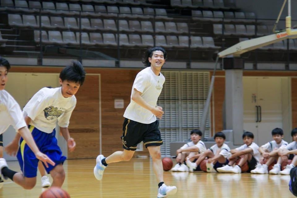 ボール教室」を開催し、#7 長野誠史選手、#16 西田公陽選手、大久保愛樹アシスタントコーチ、佐古賢一