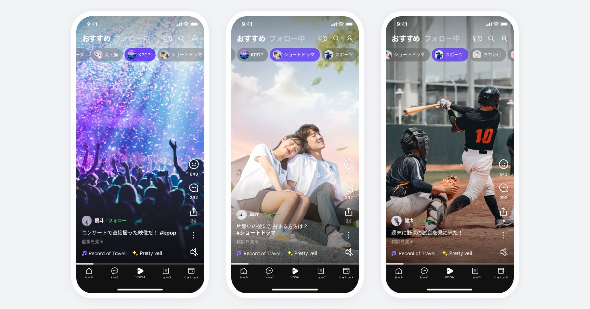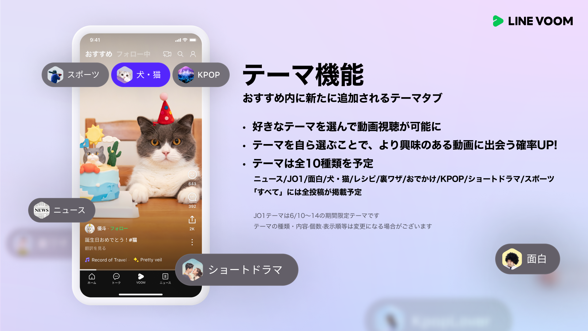 第1弾のテーマとして、「LINE VOOM」ユーザーからの高い人気を有する、毎日の話題となった「ニュース」や「スポーツ」、「犬・猫」、「レシピ」、「おでかけ」、「裏ワザ」などの定番テーマに加え、2024年6月に実施した独占ライブ配信が大きな反響を得た人気グループ「JO1」をはじめ、日本未公開のコンテンツが多数集まる「K-POP」や、そして最近話題になっている「ショートドラマ」、など、10個のテーマを提供します。