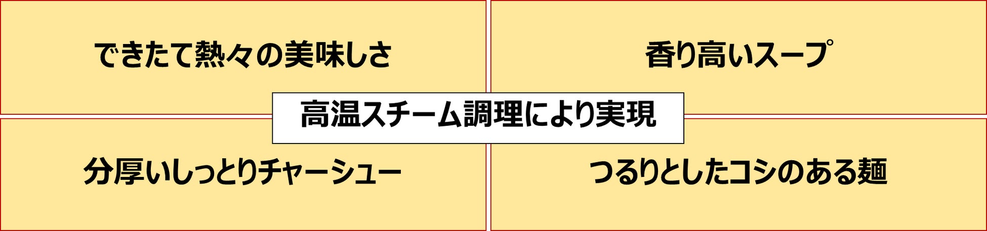 高圧・高温の水蒸気を用いて専用の冷凍食品を急速に 調理する独自の「蒸式調理」で、麺のコシ、スープや食材の豊かな香りや食感まで、専門店さながらの味わいを実現します。