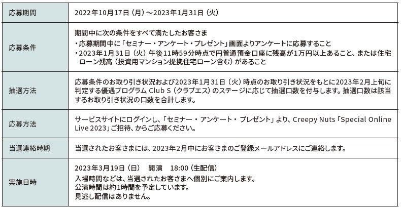 ソニー銀行株式会社(代表取締役社長:南 啓二/本社:東京都千代田区/以下 ソニー銀行)は、2022年10月17日(月)より、Creepy Nuts × Sony Bank「Special Online Live 2023」キャンペーンを実施いたしますのでお知らせいたします。ソニー銀行とお取り引きがあるお客さまだけに贈る一夜限りのスペシャル・オンラインライブへ抽選で20,000名さまをご招待いたします。