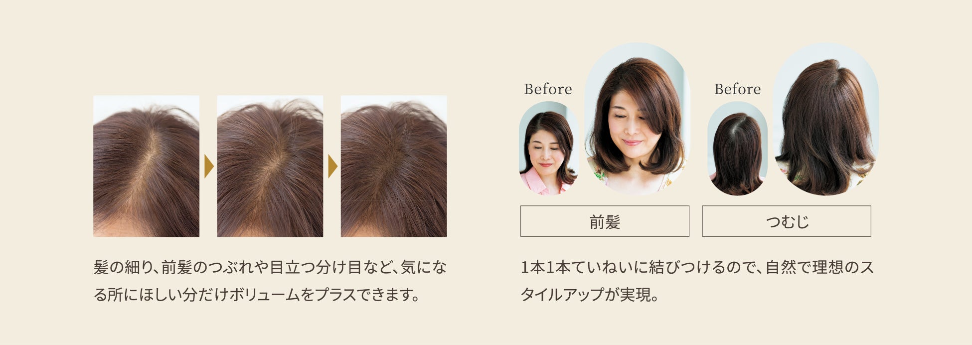 ・分け目のボリューム不足、透け感、白髪対策など幅広いニーズに対応。