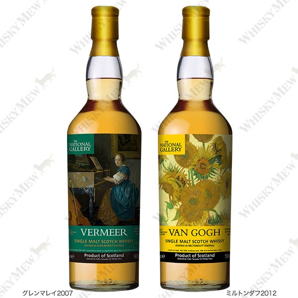その『ロンドン ナショナル・ギャラリー』所蔵の作品から、中でも日本人に人気の高い、ヨハネス・フェルメールの『ヴァージナルの前に座る若い女性』とフィンセント・ファン・ゴッホの『ひまわり』の絵画を選び、ウイスキーのラベルにしました。ウイスキーは、ウイスキー評論家の山岡秀雄氏が、ネゴシアンから購入した樽の熟成具合を見計い、結果さらに2年間熟成をさせて、瓶詰めしたものです。