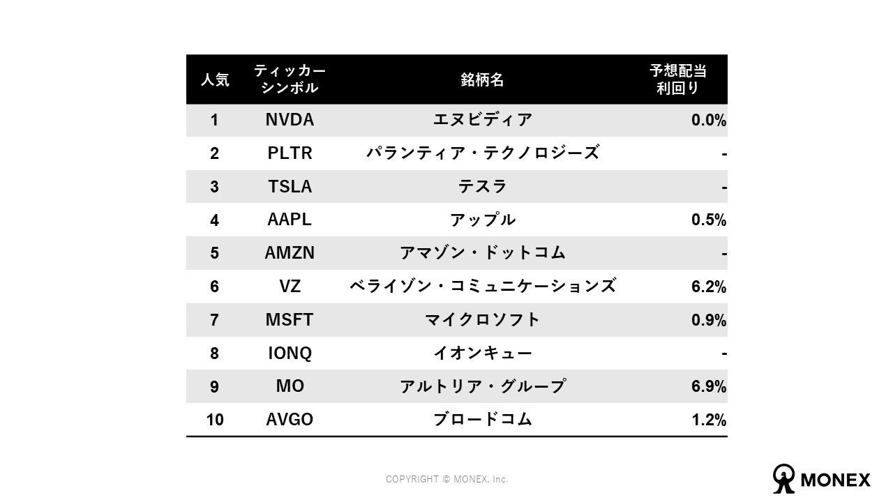 日本株の取引では景気の動向に業績が左右されにくいディフェンシブ銘柄や高配当銘柄が多く見られます。一方で米国株は高配当もありますが、マグニフィセント・セブンなど、値上がり期待の高いハイテク関連株が多く、日米の市場で投資傾向が異なっていることがうかがえます。