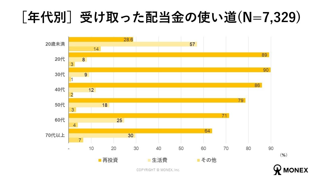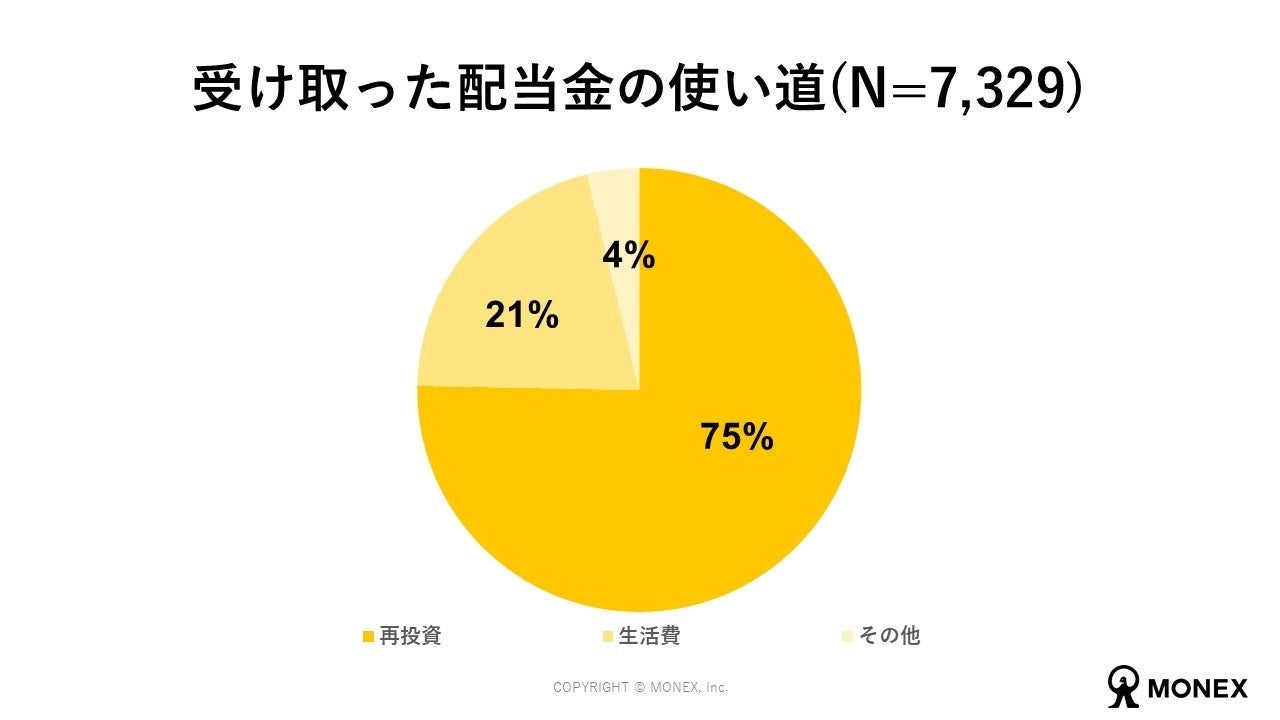 受け取った配当金は75%が再投資に回しており、生活費などで使ういわゆる「配当金生活」をしている個人投資家は2割程度ですが、配当金生活者は年齢が上がるとともに増加しており、資産をしっかり「使う」ことも意識しながら投資をしている個人投資家の行動傾向が見て取れます。その他では「使い道を気にしていない」「配当金が少ないので口座内でそのまま」というコメントが多く見受けられました。