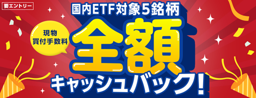 「国内ETF対象5銘柄の現物買付手数料全額キャッシュバックキャンペーン」および国内ETF(2銘柄)の手数料完全無料化実施のお知らせ