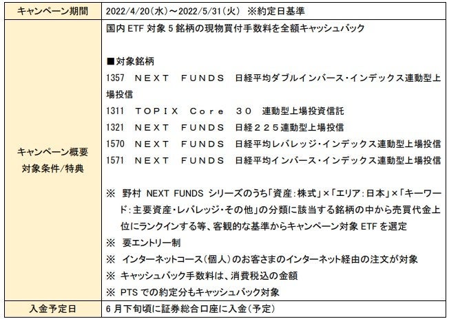 当社は、2019年12月から、国内ETF全銘柄の信用取引手数料を無料で提供していますが、本キャンペーンでは、現物取引を対象として、国内ETFの売買代金の大半を占め、個人投資家に人気の高いレバレッジ型ETFも含めた対象5銘柄の買付手数料を全額キャッシュバックします。