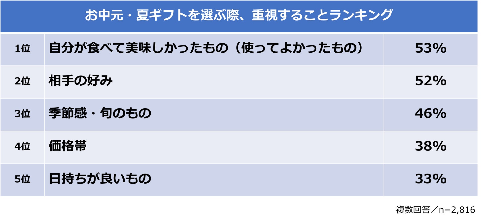 お中元・夏ギフトを選ぶ際、重視するポイントとして「価格帯」や「日持ちが良いもの」などをおさえて一番多かった回答が「自分が食べて美味しかったもの(使ってよかったもの)」という結果となりました。