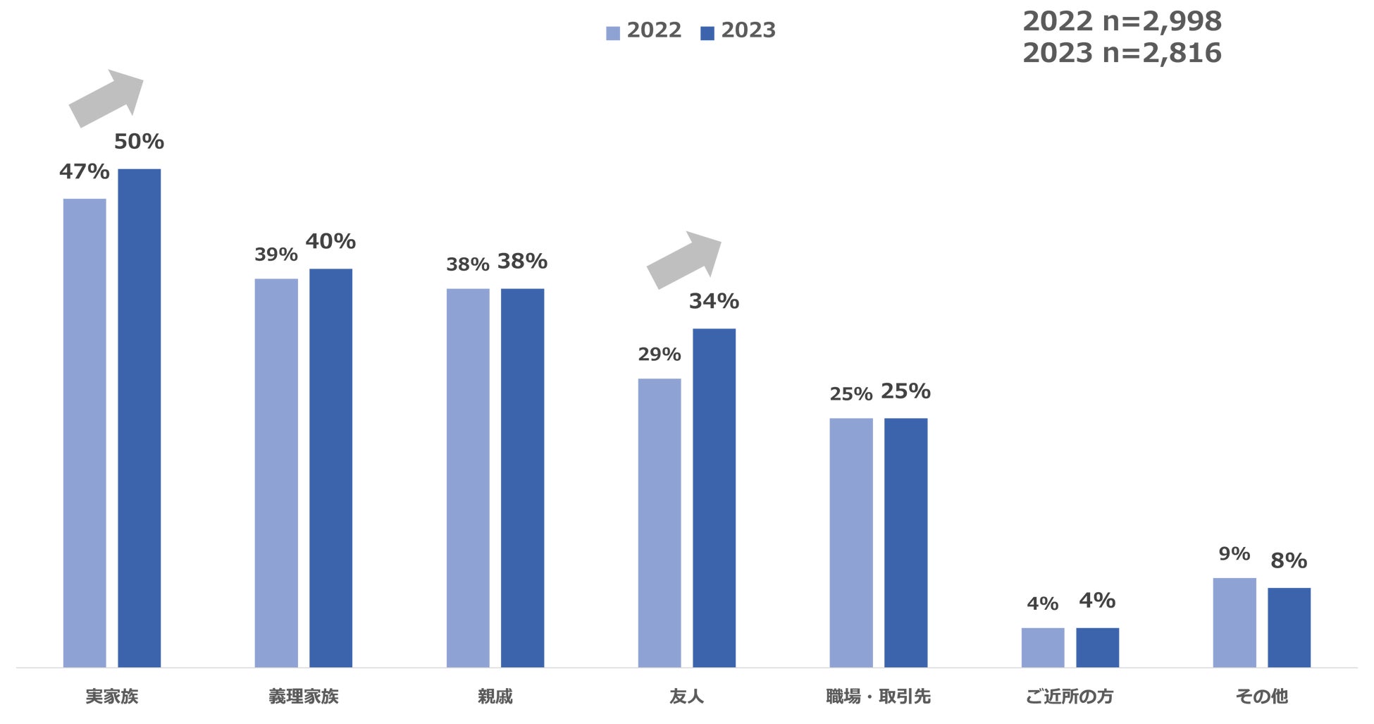 ◆お中元・夏ギフトを贈る相手 「実家族」「友人」が昨年と比較してポイントアップ