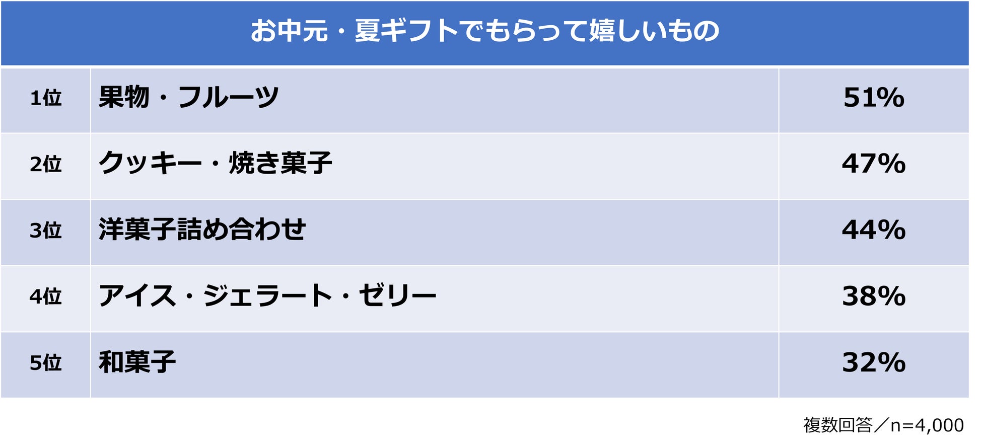 季節ごとの旬が楽しめる「果物・フルーツ」(51%)が1位に。続いて常温で日持ちがする定番ギフトの「クッキー・焼き菓子」(47%)が2位、「洋菓子詰め合わせ」(44%)が3位にランクイン。