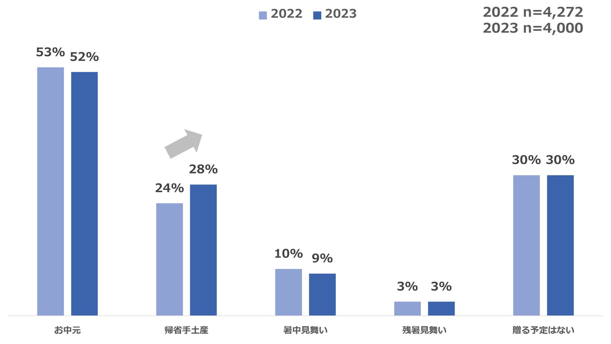 中でも、「帰省手土産」購入予定者は28%で、昨年の24%より4ポイント増加した。