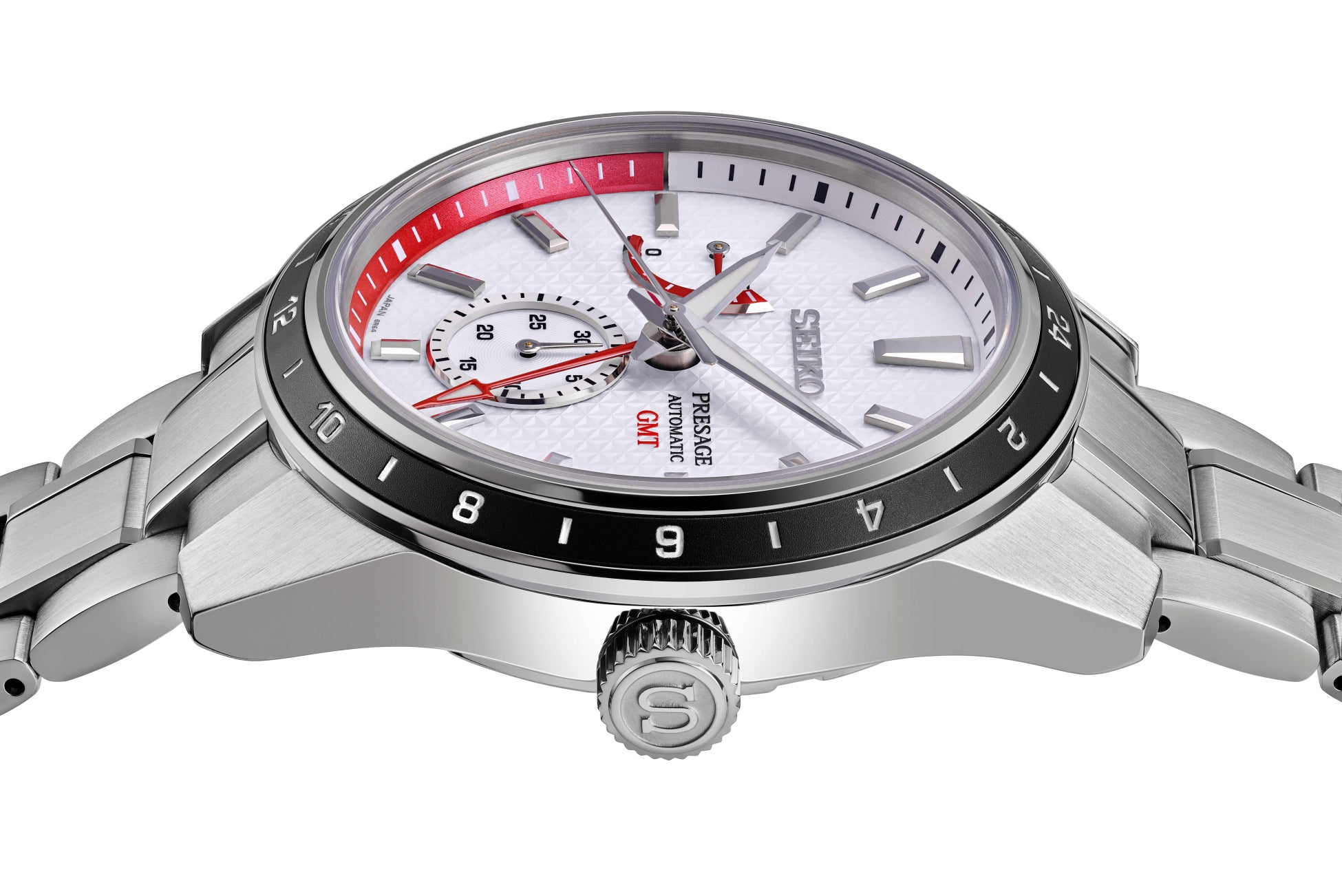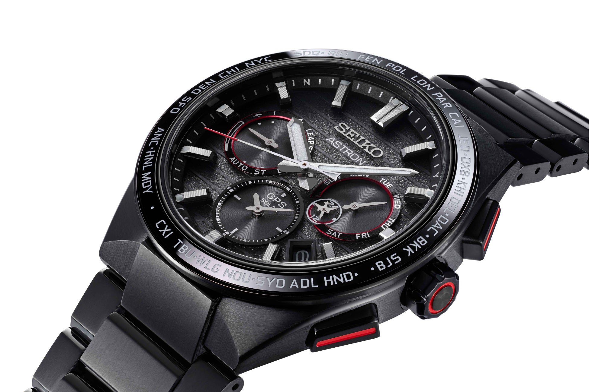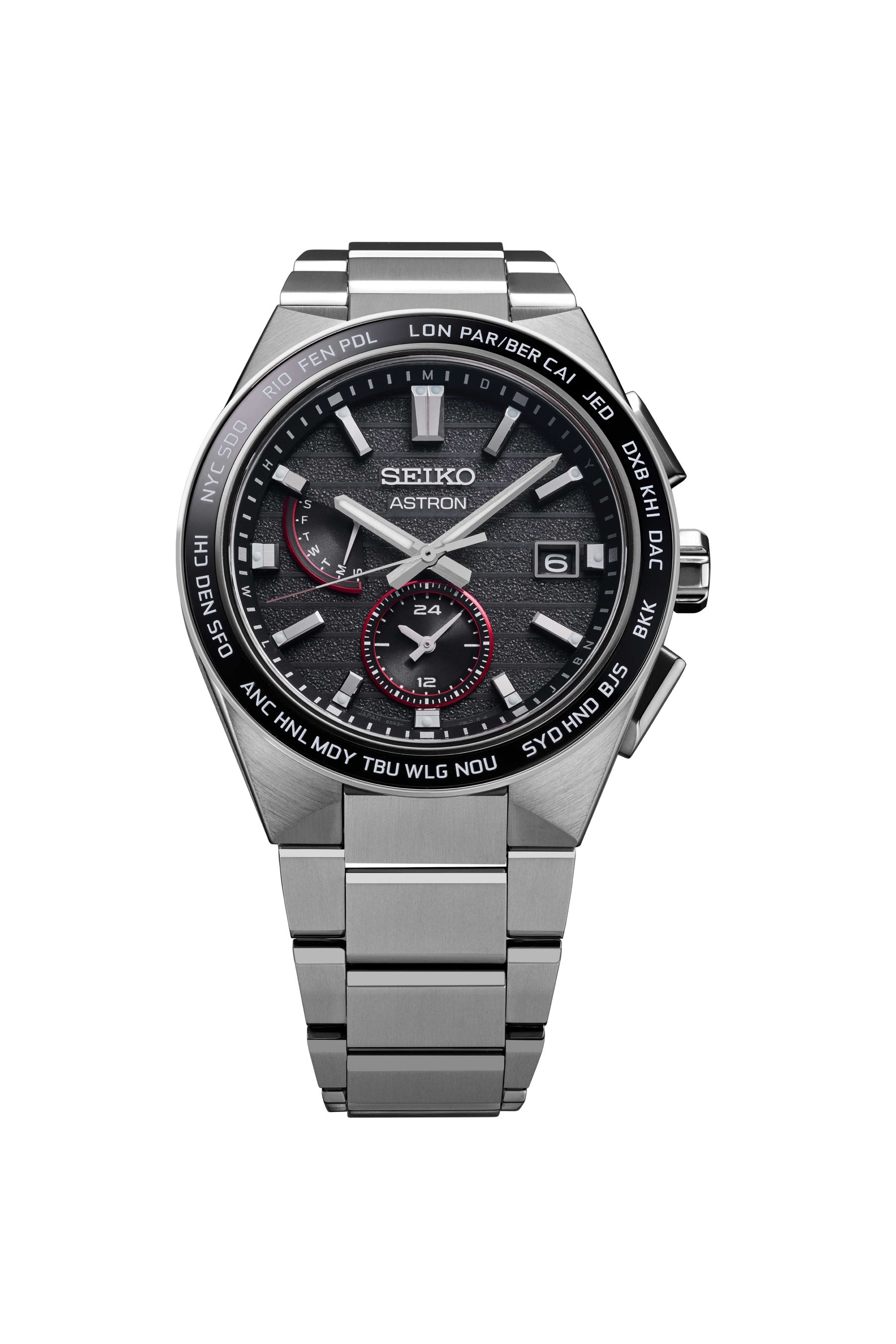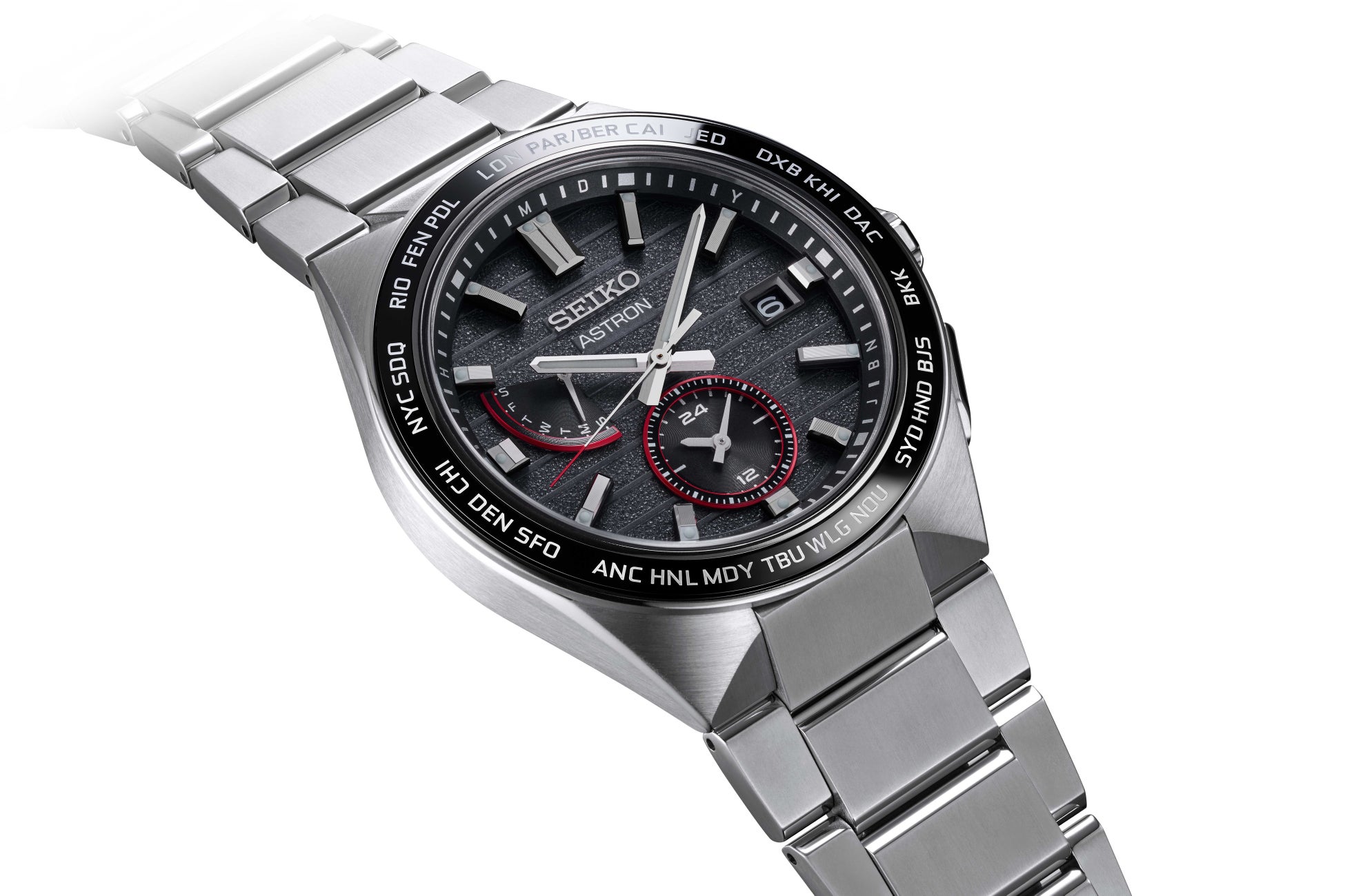全モデルに共通して、JALのロゴカラーである鮮やかな赤色を、ダイヤルのアクセントカラーとして使用しています。アストロンの2モデルにはボタンとりゅうず側面にも赤色のカラーリングを施しました。