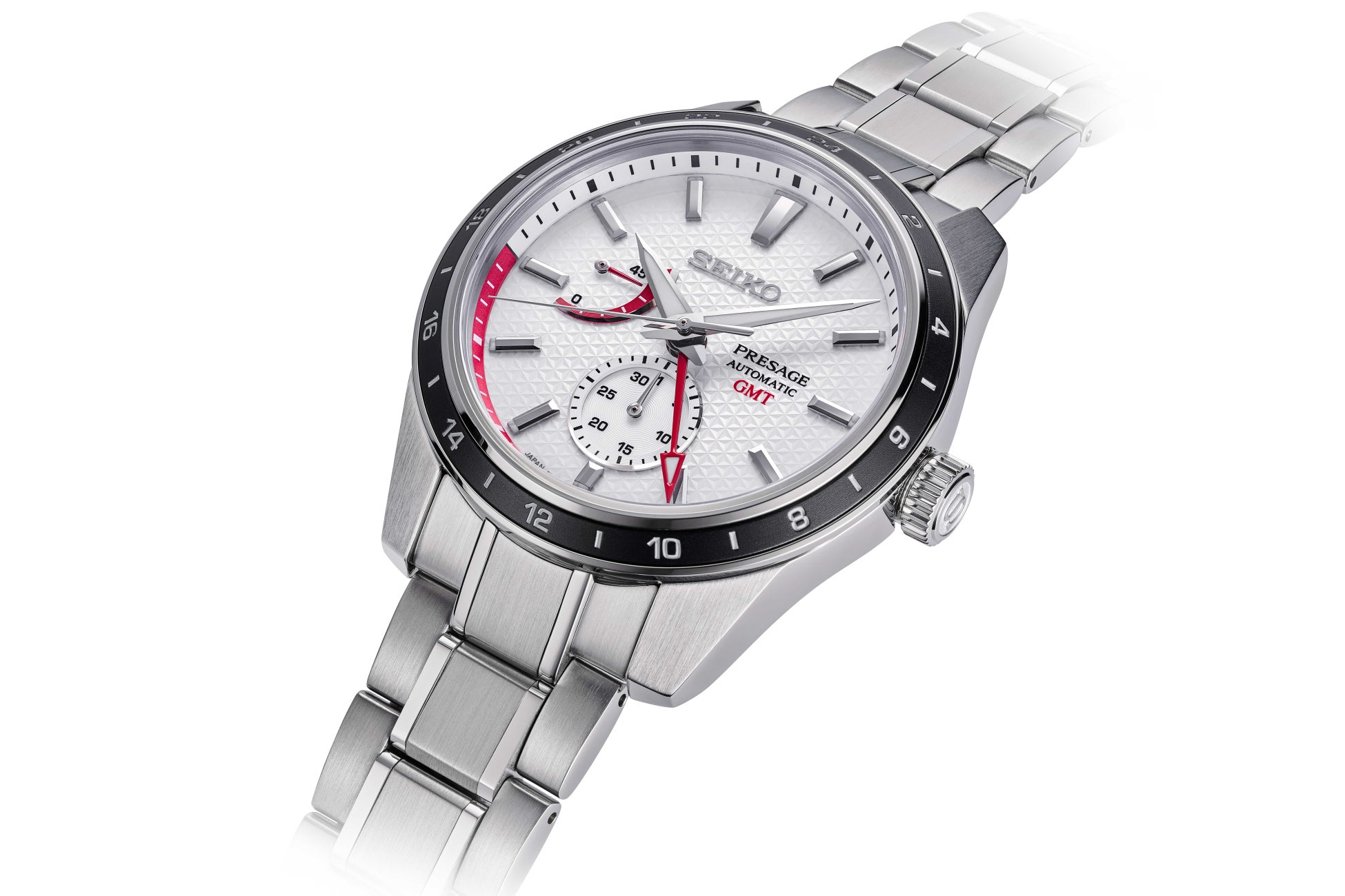 <セイコー プレザージュ> Sharp Edged Seriesの限定モデルでは、JALと共通する価値観である日本独自の美意識をデザインの随所に採り入れています。Sharp Edged Seriesの特徴である「麻の葉紋様」のダイヤルに、精緻で奥行き感のあるホワイトグラデーションを施し、雄大な空を航行する高揚感を表現しました。麻の葉紋様は平安時代から織物などに用いられ、植物の麻は丈夫で早く育つことから、日本では健やかな成長の象徴とされてきました。