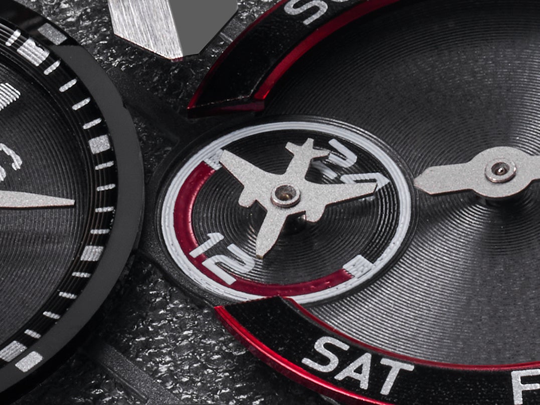ダイヤルには、航空機が飛び立つ滑走路のような溝のあるアスファルト調の型打ちパターンを採用し、フライトを目前にした高揚感がよみがえります。また、GPSソーラーモデルの4時位置には、航空機を模したAM/PM表示針を特別に採用しました。