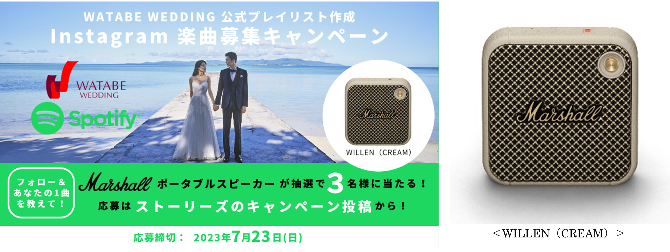 ワタベウェディング株式会社【本社:京都府京都市、代表取締役 社長執行役員:宮瀬 昌行】は、“リゾ婚の日(8月1日)”を記念して、オーディオストリーミングサービス「Spotify」とコラボレーションし、「ワタベウェディング公式ブランドプレイリスト」を制作します。これに伴い、インスタグラム上で、“リゾートで恋人と海を眺めながら聴きたい1曲”を募集し、回答いただいた方の中から抽選で3名様に、「Marshall」のポータブルスピーカー「WILLEN」が当たる、『Instagram 楽曲募集キャンペーン』を2023年7月10日(月)~7月23日(日)の期間、実施いたします。