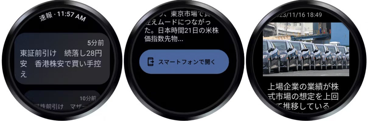 今回部門大賞を受賞したウェアラブル対応は、Wear OS 向けのアプリでニュースをスムーズに閲覧できるようにしたものです。スマートウォッチで日経電子版の速報ニュースを受け取ったり、記事見出し一覧から記事本文も表示できたりします。また、スマートウォッチで表示した記事の続きをスマートフォンで読むこともできます。