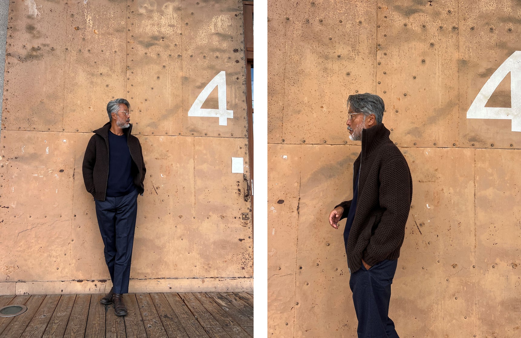 “ボリューム襟のジップアップニットはリサイクルウール使用、サラッと大人なメリノクルーはRWS認証済みのウール100%、モダンクラシックな大人スラックスはイタリア製の上質なウールフランネル生地を使用と総てに隙なし。” By 種市暁 さん/ @taneichiakira